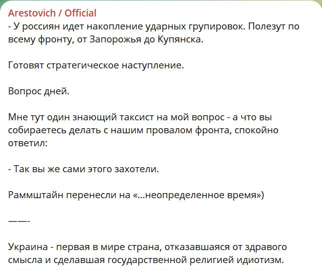 "У россиян идет накопление ударных группировок. Полезут по всему фронту, от Запорожья до Купянска. Готовят стратегическое наступление. Вопрос дней", – написал он.