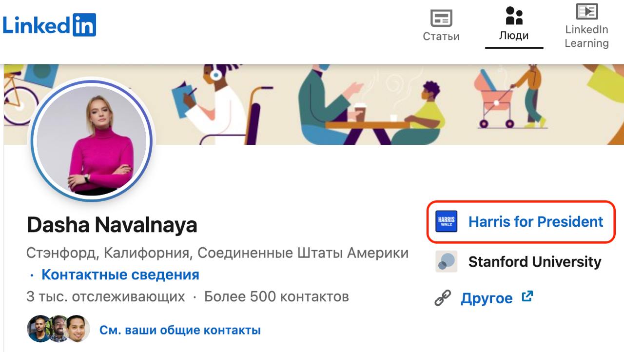 Ее текущая карьерная позиция обозначена как Field Organizer, что предполагает работу с волонтерами. Также Навальная занимается связями с общественностью, мобилизацией избирателей и организацией работы штаба. В штабе Харрис дочь оппозиционера работает с августа 2024 года.