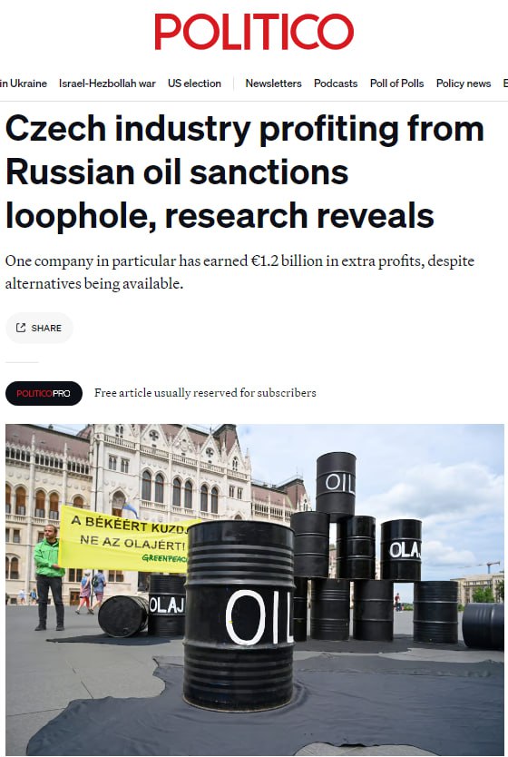 Такая ситуация возможна, поскольку ЕС предоставил Чехии исключение из своего нефтяного эмбарго. Причем зависимость Чехии от российской нефти фактически выросла в 2023 году примерно до 60 процентов, несмотря на намерения правительства постепенно отказаться от закупок у Москвы.