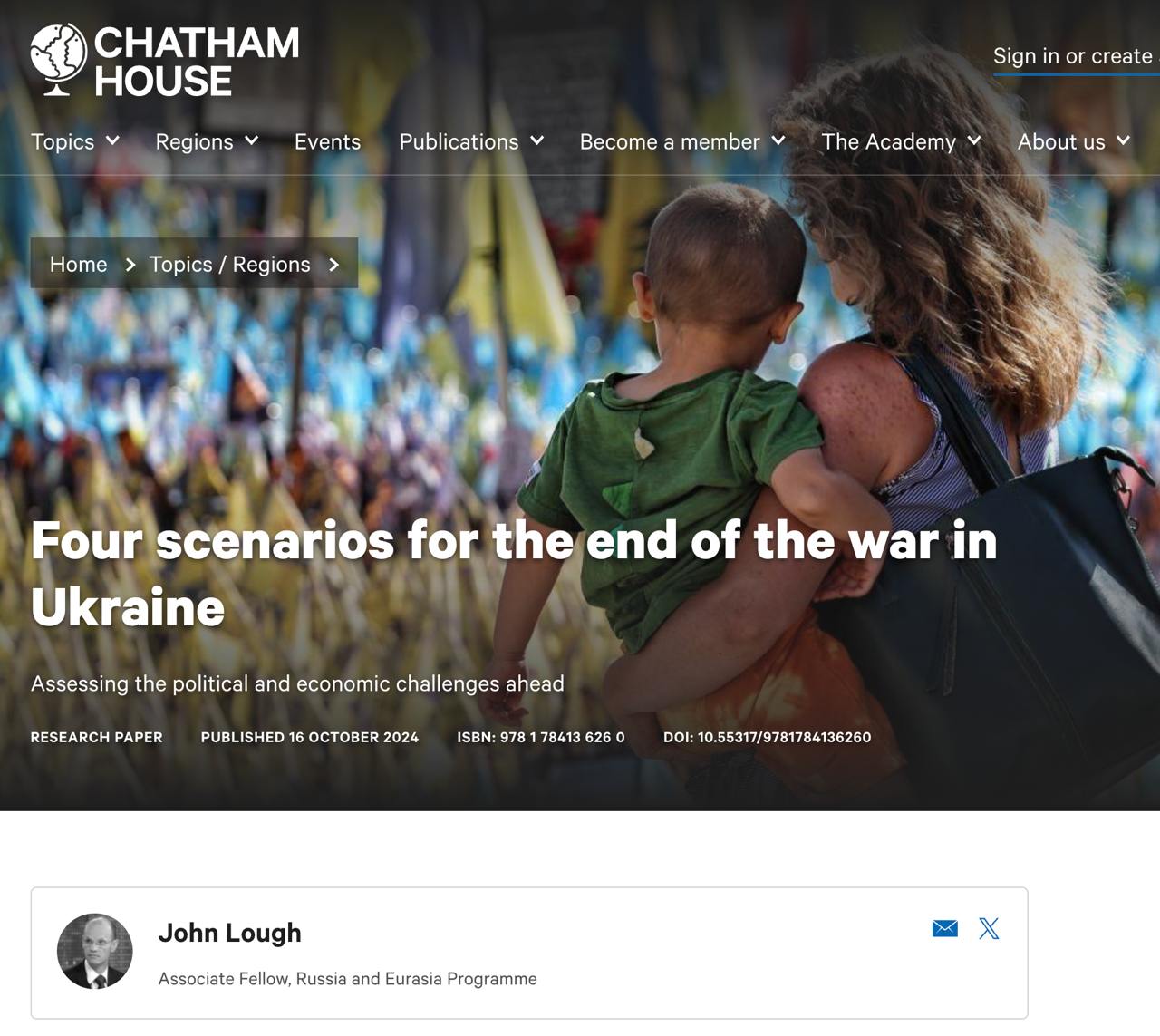 18:04 На сайте Chatham house (Королевский институт международных отношений) накануне выступления там Валерия Залужного вышла колонка Джона Лафа о четырех сценариях развития войны в Украине.
