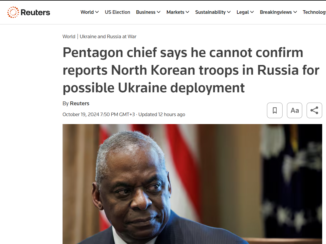 11:28 Глава Пентагона Ллойд Остин не может подтвердить информацию о размещении северокорейских войск в России для отправки в Украину, пишет Reuters.