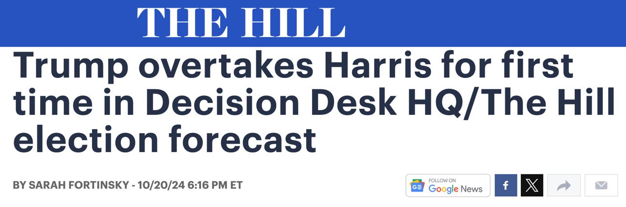 Он лидирует в 6 из 7 колеблющихся штатов, где будет решаться итог выборов. Только в Пенсильвании, родном штате нынешнего президента Джо Байдена, сейчас больше шансов у Харрис.