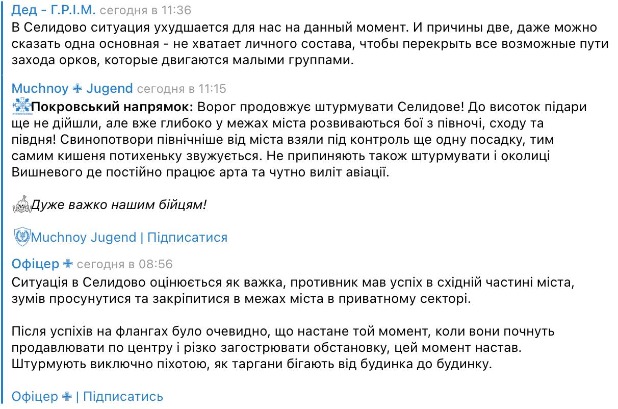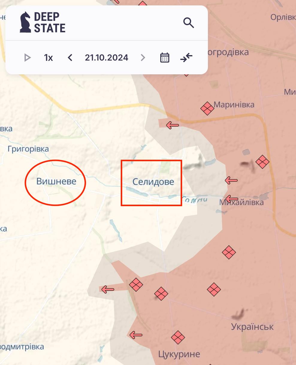 Также "Мучной" подтверждает данные российских пабликов, что уже идут штурмы Вишнёвого к западу от Селидово, чтобы отрезать город от Покровска. Карта Deep State пока даёт картину по состоянию на вчера и не отображает этих данных.