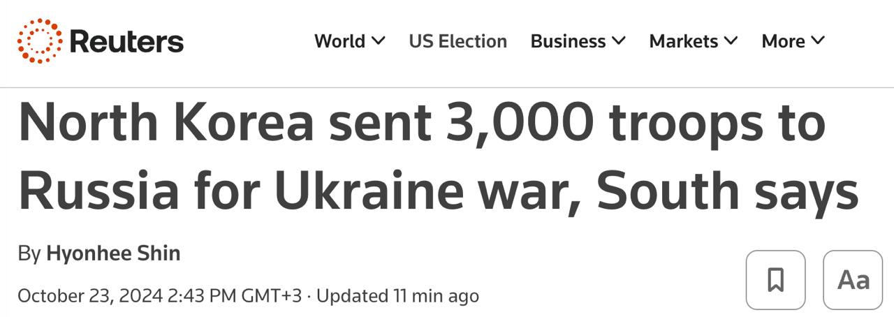 Reuters также приводит заявление члена парламентского комитета Южной Кореи по разведке Пак Сон Вона о том, что Северная Корея удвоила количество своих солдат в РФ до 3000. По данным Сеула, Пхеньян обещал Кремлю предоставить в общей сложности около 10 тысяч военных, развертывание которых, как ожидается, будет завершено к декабрю. Они должны помочь РФ в войне против Украины.