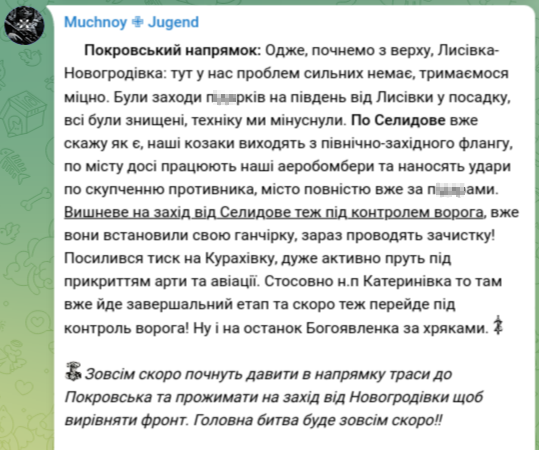 "По Селидово уже скажу как есть: наши козаки выходят с северо-западного фланга, по городу всё ещё работают наши аэробомберы и наносят удары по скоплению противника, город полностью уже за п@д@рами. Вишнёвое к западу от Селидово тоже под контролем врага, уже они установили свою тряпку, сейчас производят зачистку!" – написал военный.
