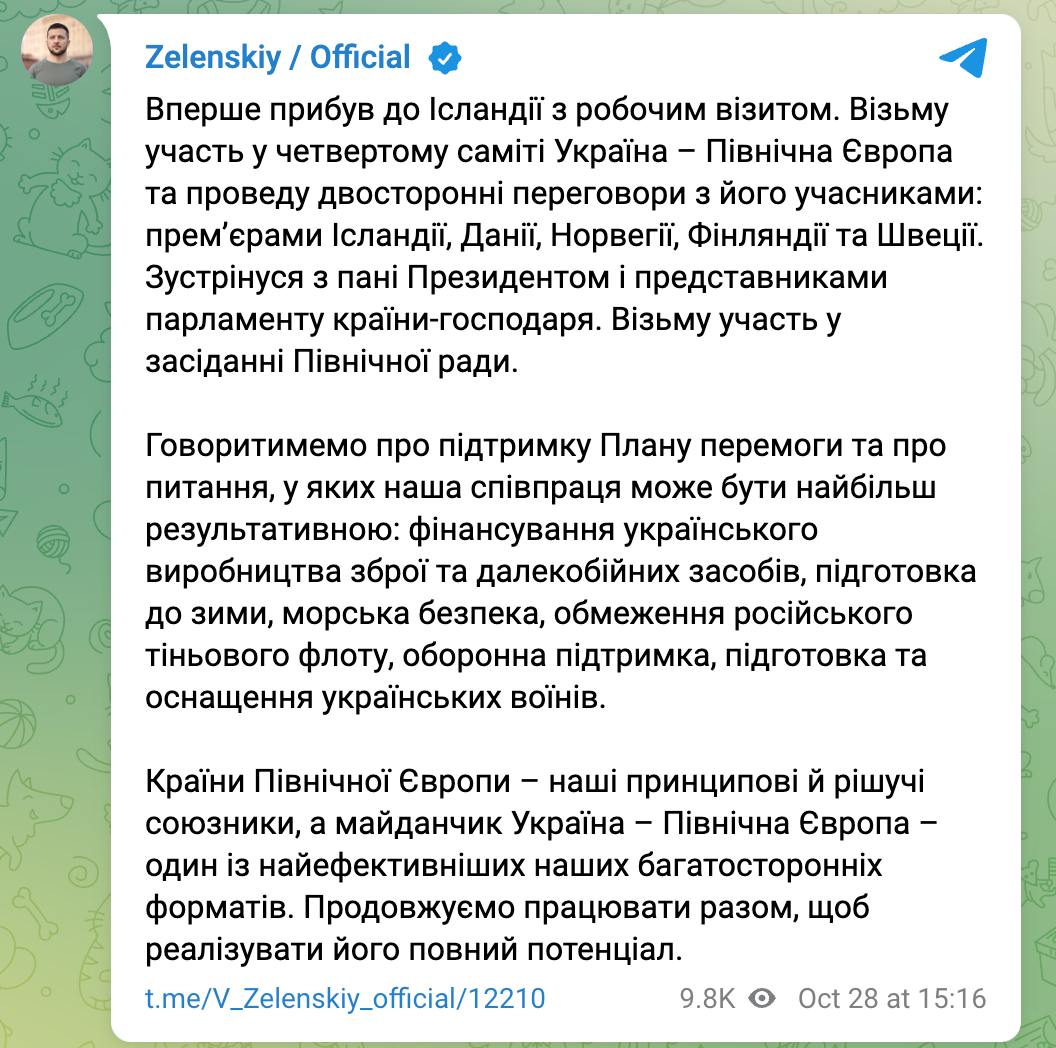 В Исландии президент собирается переговорить с местным премьер-министром, а также с главами правительств Дании, Норвегии, Финляндии и Швеции. Стороны будут обсуждать "финансирование украинского производства оружия и дальнобойных средств", подготовку к зиме, морскую безопасность, ограничения российского теневого флота и оборонную поддержку Украины.