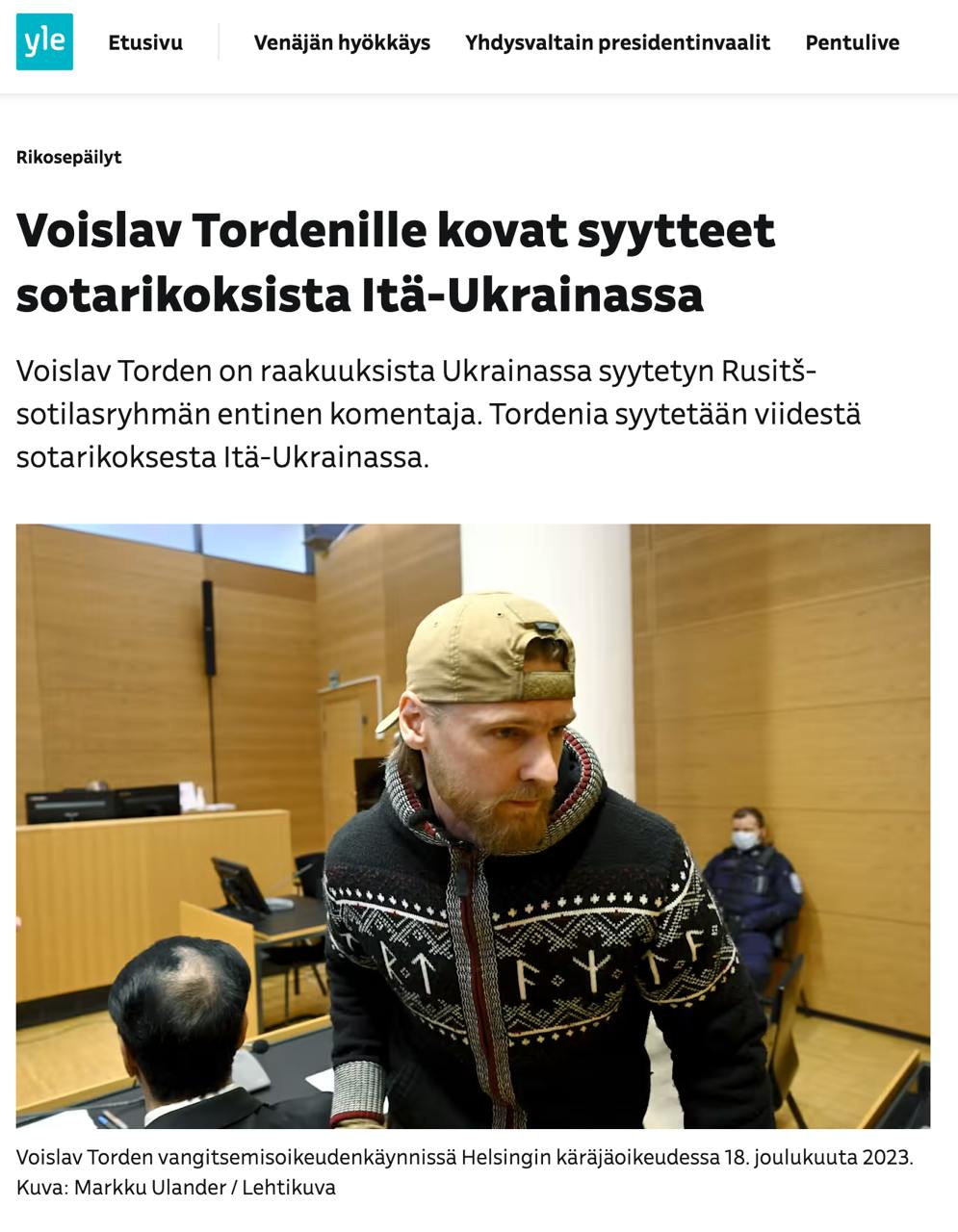 Прокуратура Финляндии предъявила обвинения одному из лидеров неонацистской российской группировки "Русич" Воиславу Тордену (до смены паспорта его звали Ян Петровский) в совершении военных преступлений в Украине осенью 2014 года.