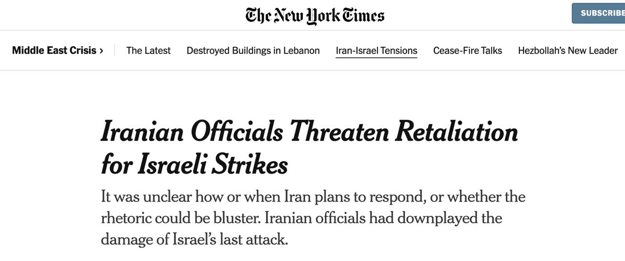 Напомним, в ночь на 26 октября Израиль нанёс удар по Ирану. Западные СМИ писали, что были атакованы военные цели, но не ядерные или нефтяные объекты, как изначально планировал Израиль, но чему противились США.