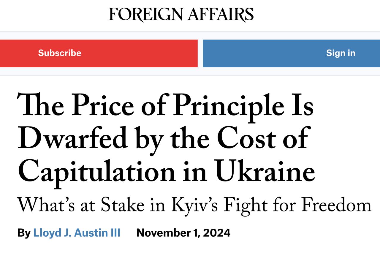"Для тех, кто думает, что американское лидерство обходится дорого, подумайте о цене американского отступления. Перед лицом агрессии цена принципа всегда ничтожна по сравнению с ценой капитуляции", - заявляет Остин (последняя фраза вынесена в заголовок статьи).