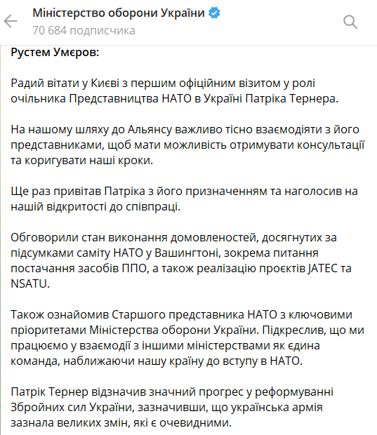 "Обсудили состояние выполнения договоренностей, достигнутых по итогам саммита НАТО в Вашингтоне, в частности, вопрос поставки средств ПВО, а также реализацию проектов JATEC и NSATU. Патрик Тернер отметил значительный прогресс в реформировании Вооруженных сил Украины, отметив, что украинская армия претерпела большие изменения, которые очевидны. Дополнительно проинформировал коллегу об участии военных КНДР в текущей эскалации агрессии против Украины", - написал Умеров.
