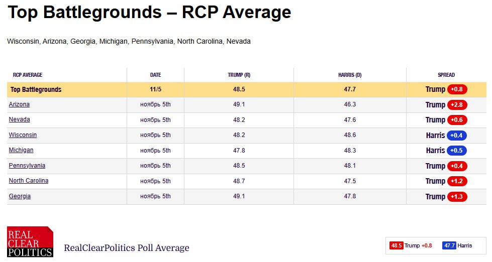 Выборы в США. Дональд Трамп опережает Камалу Харрис в большинстве колеблющихся штатов