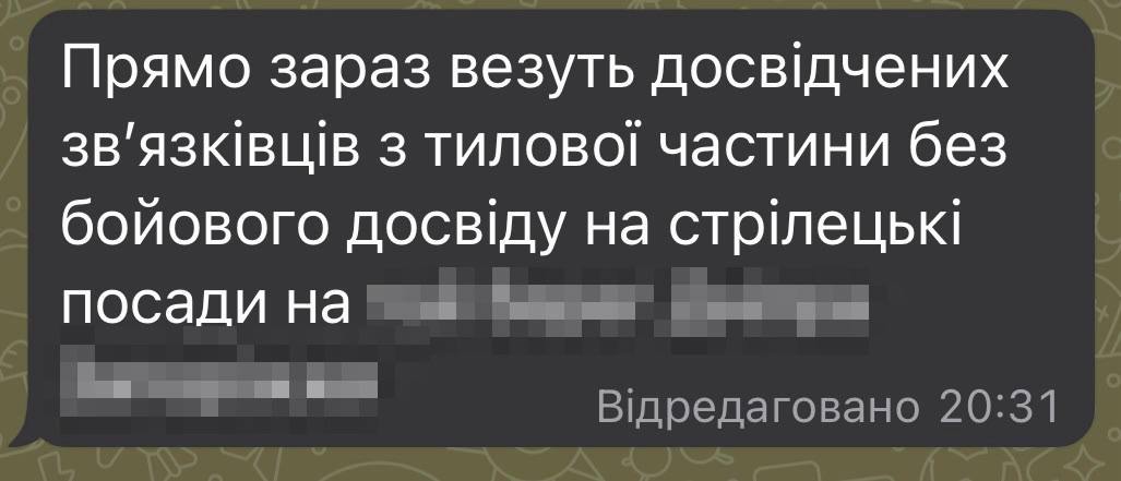 14.51 Перевод боевых медиков и других специалистов, в частности, связистов, в пехоту продолжается. Об этом заявляет нардеп Марьяна Безуглая и публикует соответствующие заявления.