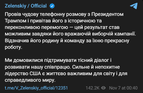 "Провел отличный телефонный разговор с президентом Трампом и поздравил его с исторической и убедительной победой - этот результат стал возможным благодаря его поразительной избирательной кампании. Отметил его семью и команду за их прекрасную работу. Мы договорились поддерживать тесный диалог и развивать наше сотрудничество. Сильное и твердое лидерство США является жизненно важным для мира и для справедливого мира", - написал Зеленский.