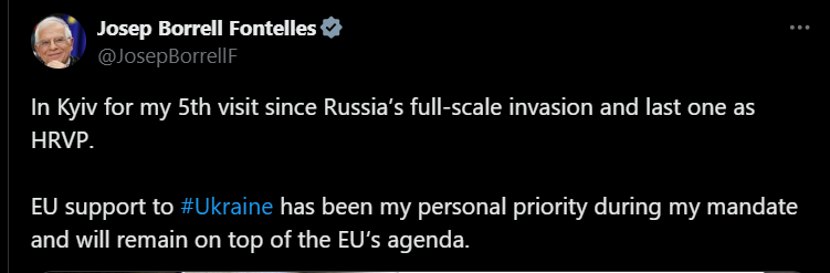 "Поддержка Украины была моим личным приоритетом в период моего мандата и останется главным вопросом повестки дня ЕС", - написал глава европейской дипломатии.