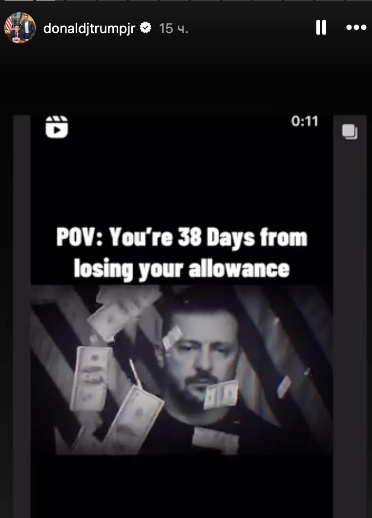 В сторис в Инстаграме он опубликовал черно-белый мем, где на украинского президента сыпятся доллары и подписал: "У тебя осталось 38 дней до потери пособия".
