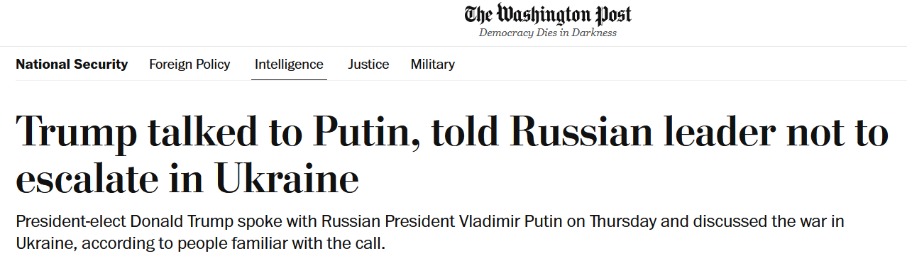 Отметим, что Путин как раз 7 ноября впервые поздравил Трампа с победой на выборах и заявил, что готов рассматривать его предложения по Украине.