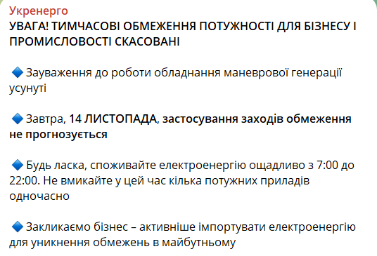 Между тем в компании "Укрэнерго" сообщили, что ограничения света для промышленности и бизнеса уже отменены.