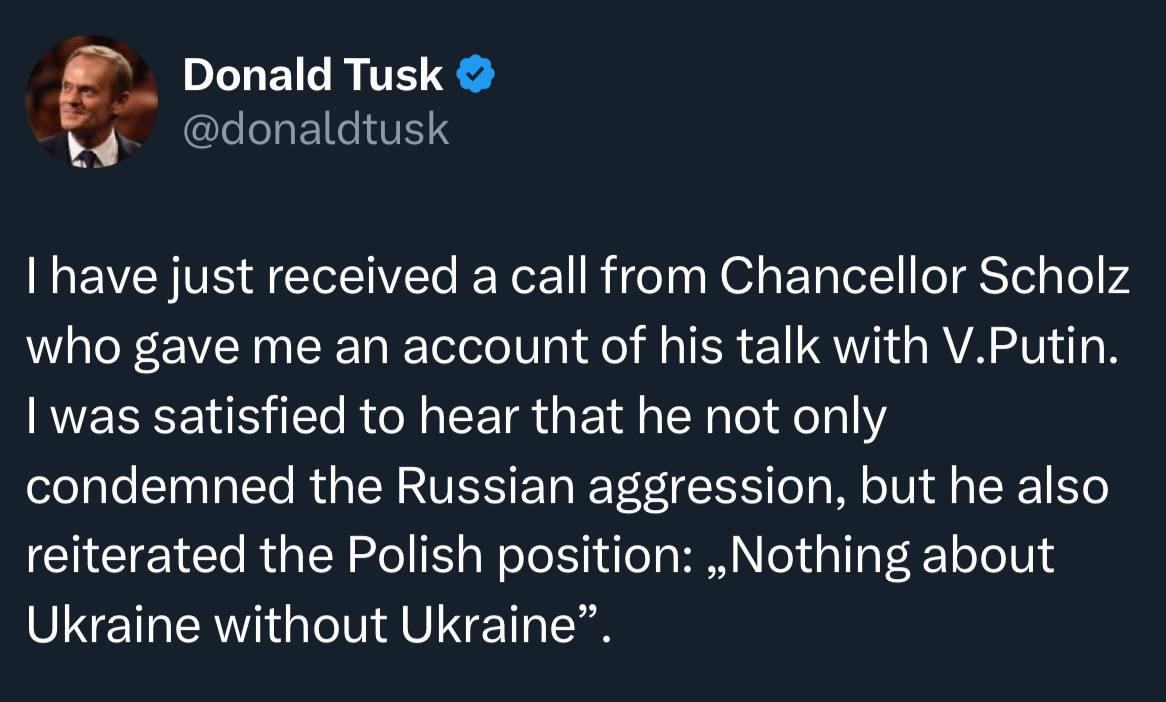 "Мне только что позвонил канцлер Шольц, который рассказал мне о своем разговоре с В. Путиным. Я был рад услышать, что он повторил польскую позицию: "Ничего об Украине без Украины", – написал Туск в Х.