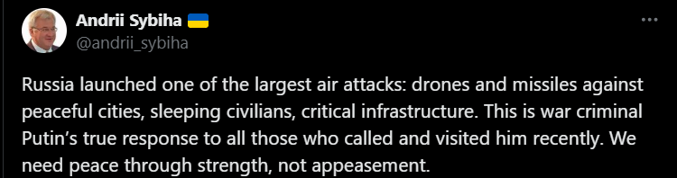 "Россия начала одну из крупнейших воздушных атак: беспилотники и ракеты против мирных городов, спящих мирных жителей, критически важной инфраструктуры. Это истинный ответ военного преступника Путина всем тем, кто звонил и посещал его недавно. Нам нужен мир силой, а не умиротворением", - написал он в соцсети Х.