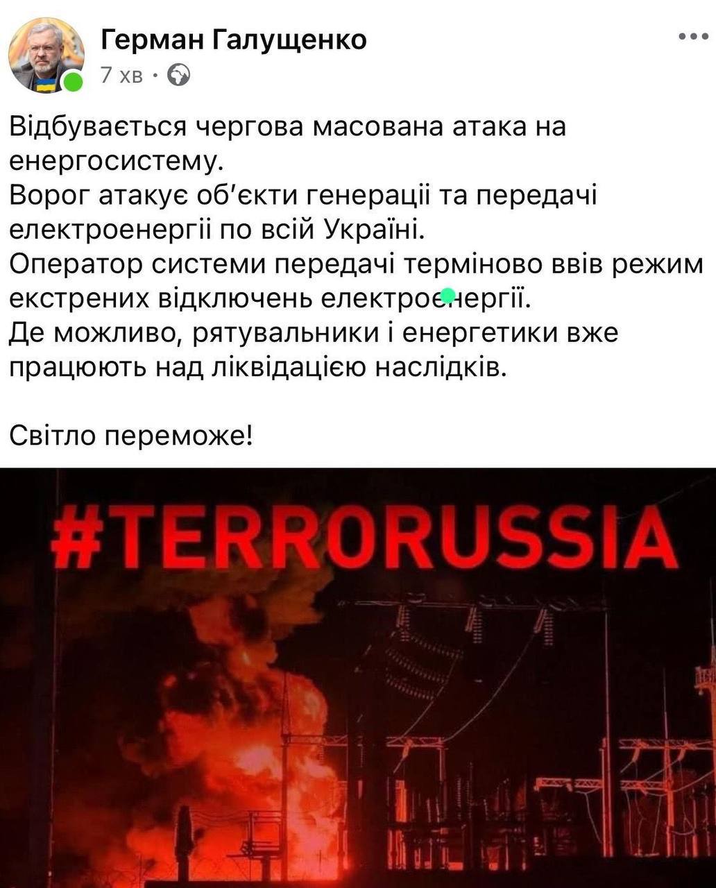 "Очередная массированная атака на энергетическую систему. Враг атакует объекты генерации и передачи электроэнергии по всей Украине", - написал он в Facebook.