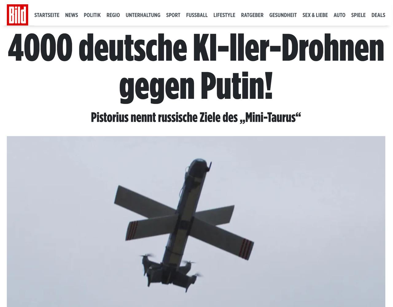 10.35 Германия передаёт Украине «мини-Taurus» - 4000 дронов с искусственным интеллектом, которые могут сами наводиться на цель, сообщает Bild.