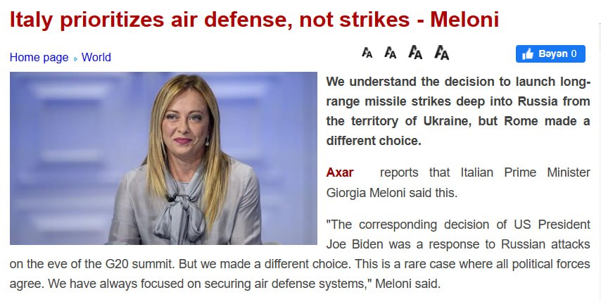 18.27 Италия не поддерживает решение Байдена разрешить ВСУ наносить удары западным дальнобойным оружием вглубь России, хотя и понимает его.