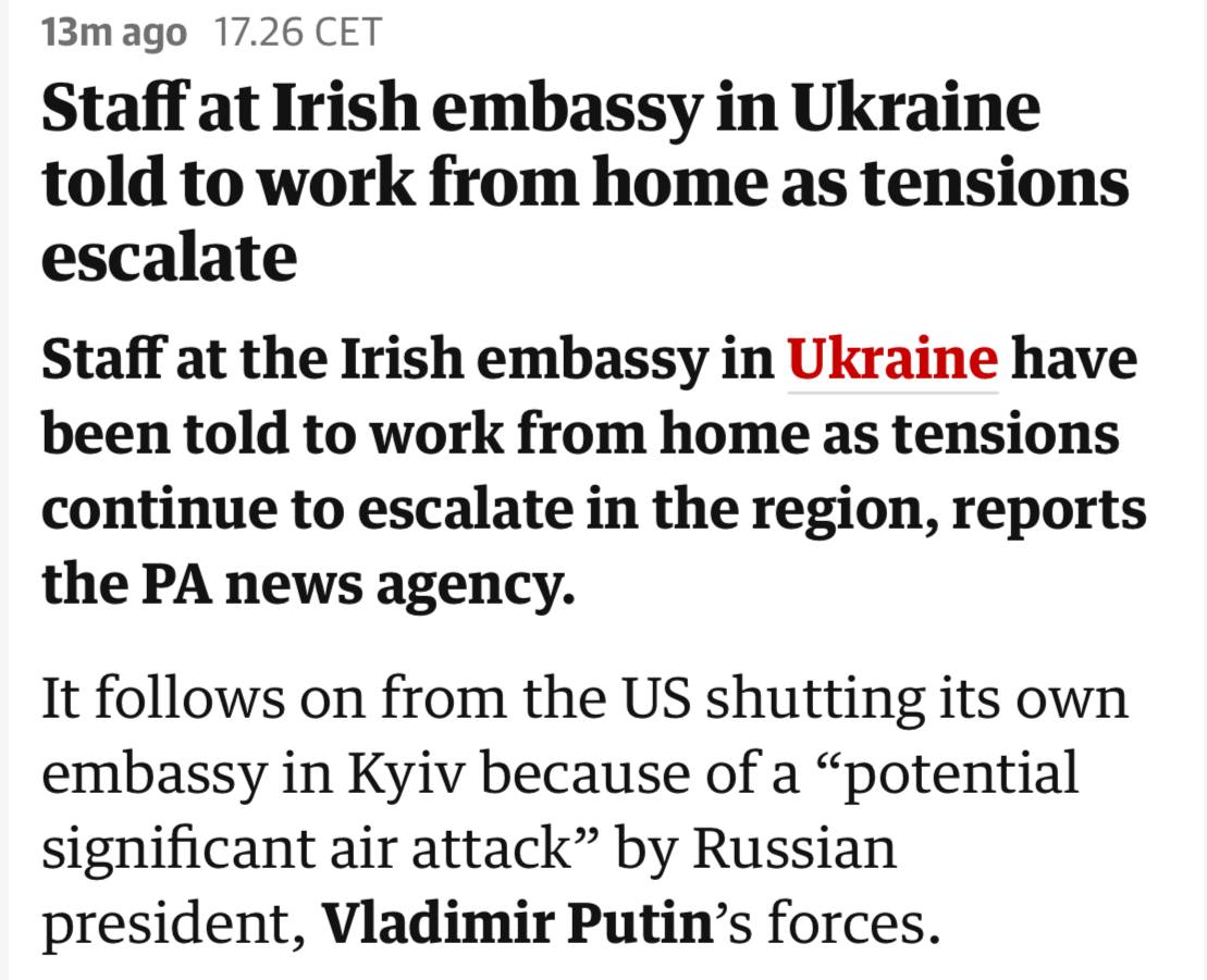 После консультаций с другими посольствами Ирландия приказала сотрудникам в Украине работать дистанционно