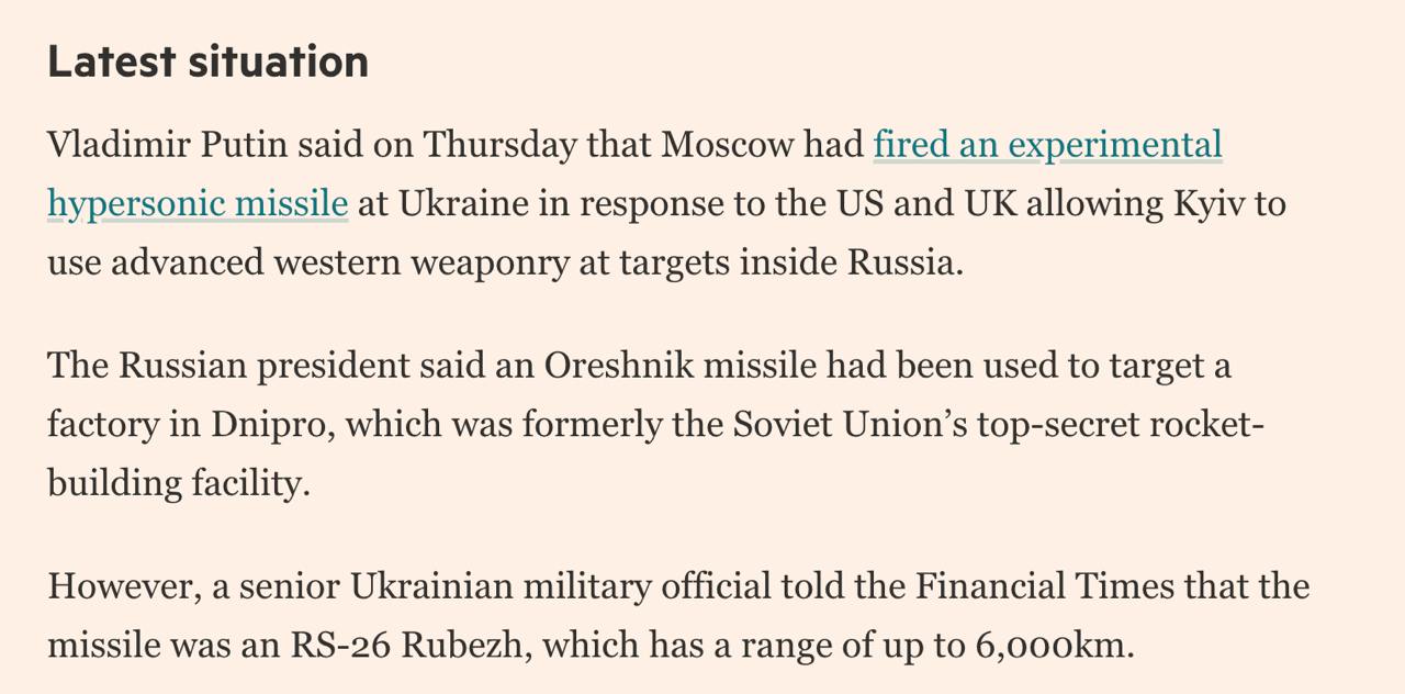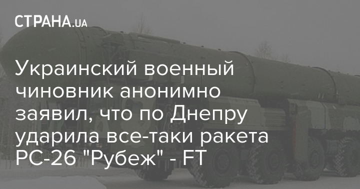 Украинский военный чиновник анонимно заявил Financial Times, что по Днепру вчера ударила все-таки ракета РС-26 "Рубеж" с дальностью полета до 6000 км, а не "Орешник", как заявил Владимир Путин.