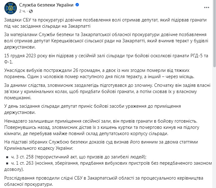 Депутат Керецковского сельского совета Сергей Батрин, который в декабре прошлого года взорвал гранаты на заседании органа, получил пожизненное лишение свободы.