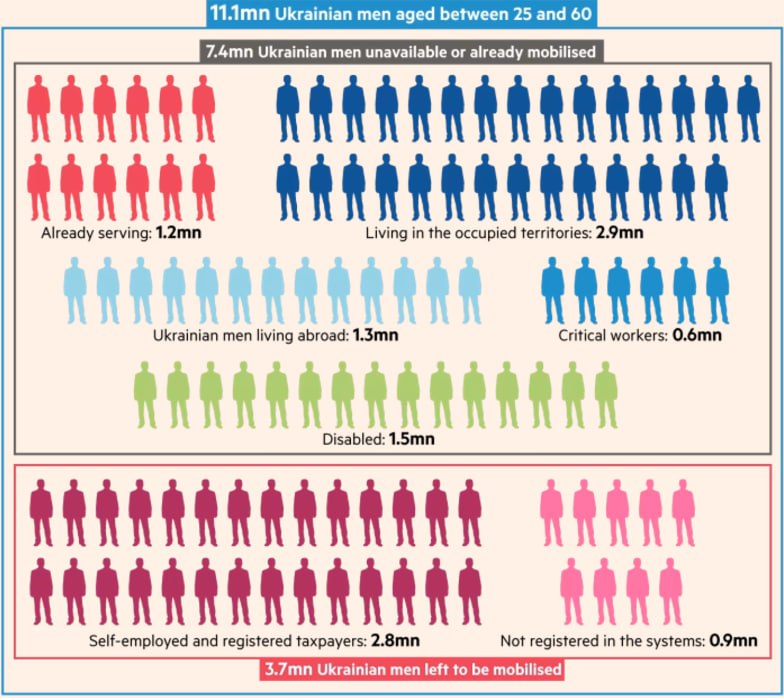 Согласно исследованию издания, основанному на данных комитета Верховной Рады по вопросам экономического развития, количество граждан Украины мужского пола в возрасте от 25 до 60 лет составляет 11,1 млн.