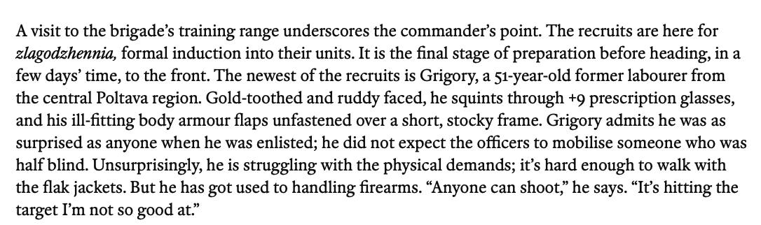 Еще большей проблемой является качество новобранцев. Командиры ВСУ говорят, что мобилизованные «в основном слишком стары или немотивированы, чтобы быть полезными». Издание на одном из украинских полигонов нашло 51-летнего новобранца со зрением минус 9.