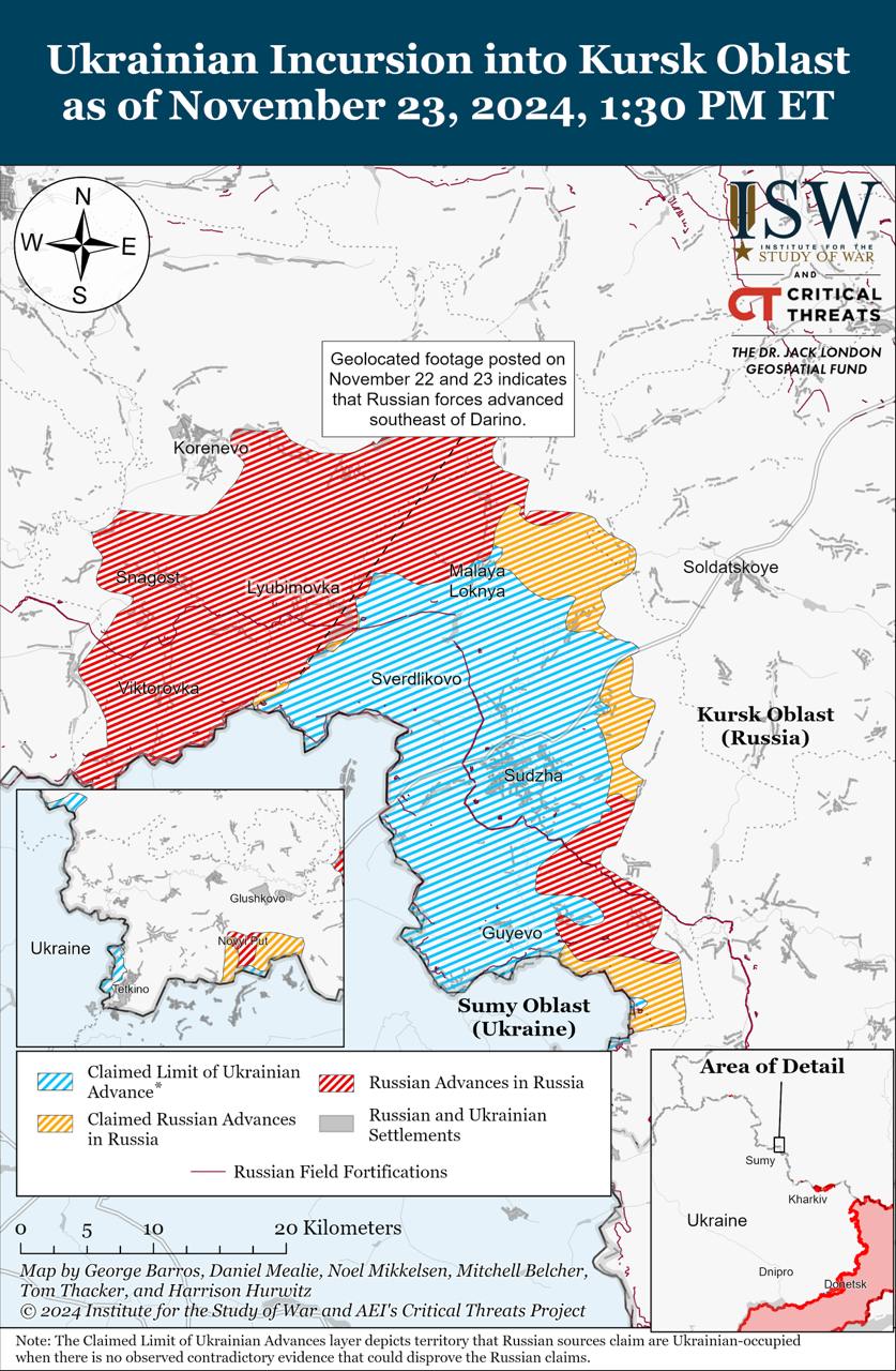 Американский "Институт изучения войны" публикует карту об изменении ситуации на фронте. Сообщается, что российские войска имели определенные успехи в Курской области.