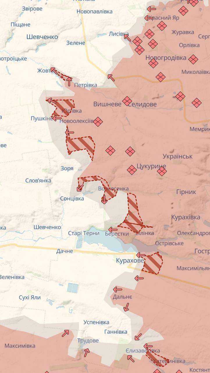 Что касается Покровска, похоже, россияне пытаются обойти его с юга. Как свидетельствует карта Deep State, армия РФ продвинулась в районе села Желтое.