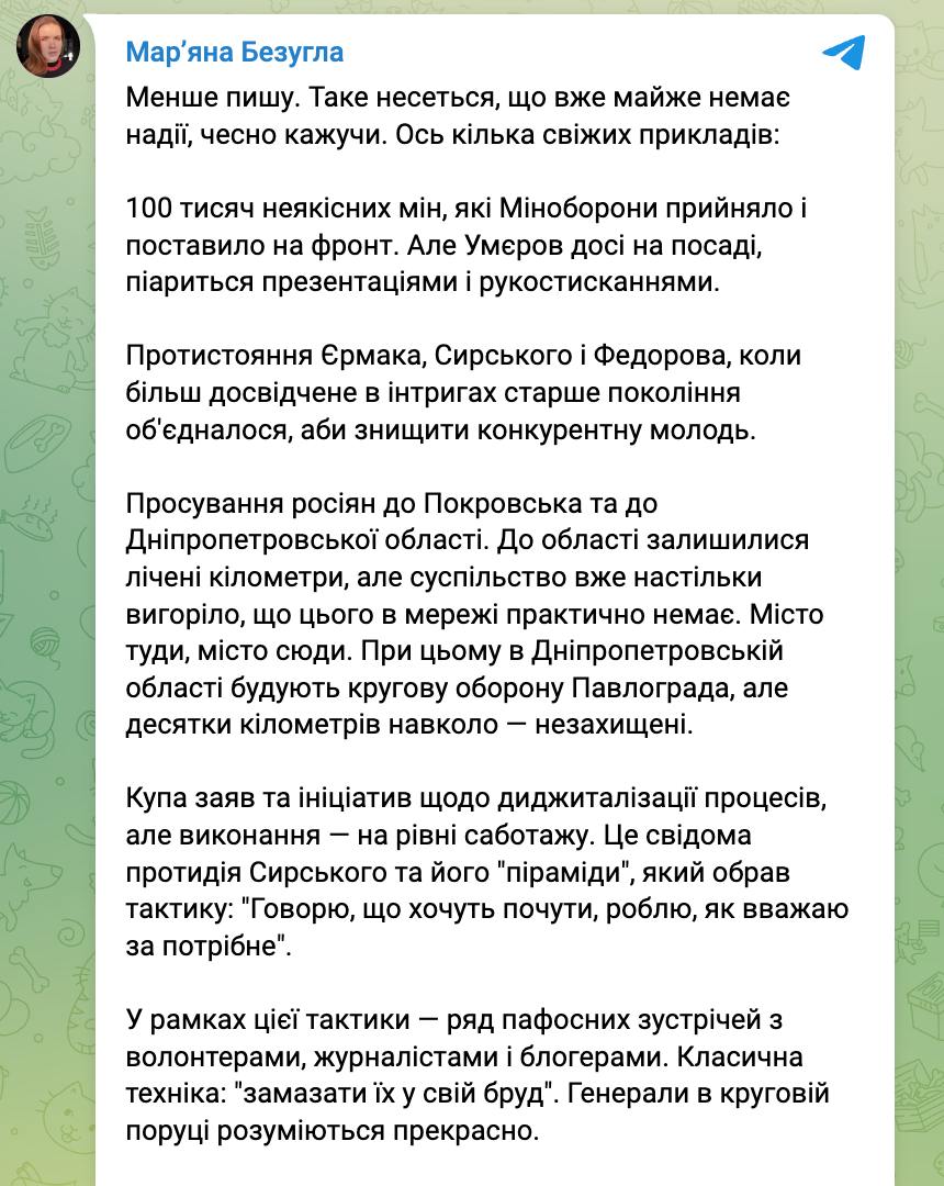 - "Продвижение россиян в Покровск и Днепропетровскую область. До области остались считанные километры, но общество уже так выгорело, что этого в сети практически нет. Город туда, город сюда. При этом в Днепропетровской области строят круговую оборону Павлограда, но десятки километров вокруг – незащищенные".