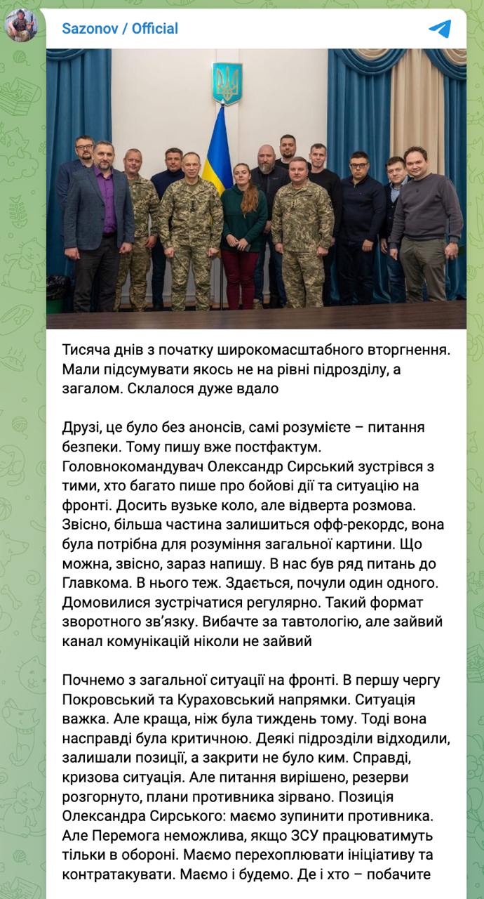 Такое заявление сделал главнокомандующий ВСУ Александр Сырский на недавней встрече с военными блогерами. Подробности заявления привел в своем телеграм-канале участник встречи военный Кирилл Сазонов.