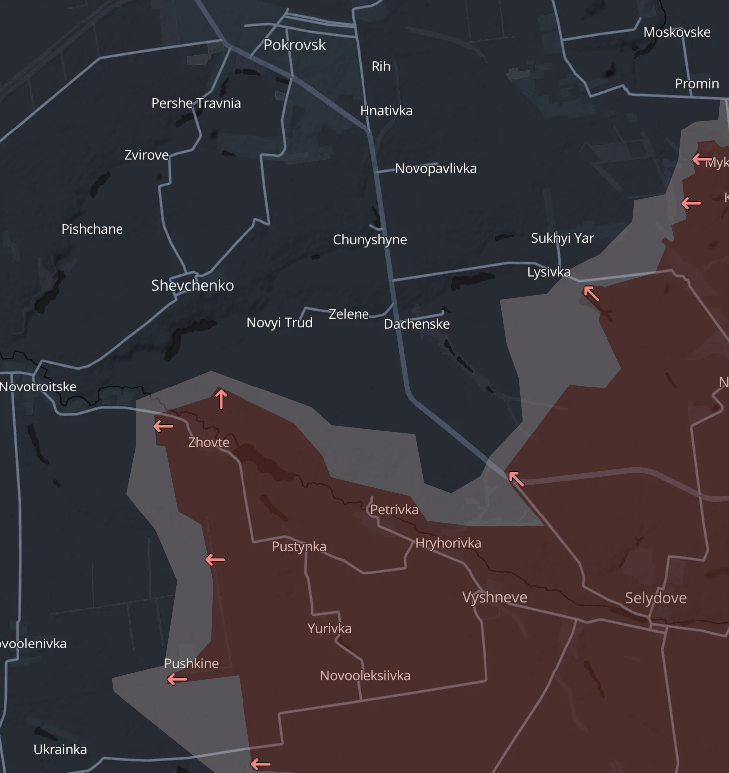 Севернее россияне продолжают относительно быстро продвигаться к югу от Покровска. Они приблизились к населенным пунктам, через которые идет дорога в направлении Курахово - Шевченко, Новотроицкому и Новоеленовке.