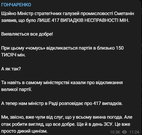 Партию в 150 тысяч мин отозвали, когда обнаружили брак в сотнях изделий. Глава Минстратегпрома Герман Сметанин заявил в Верховной Раде, что было 417 случаев неисправности мин.