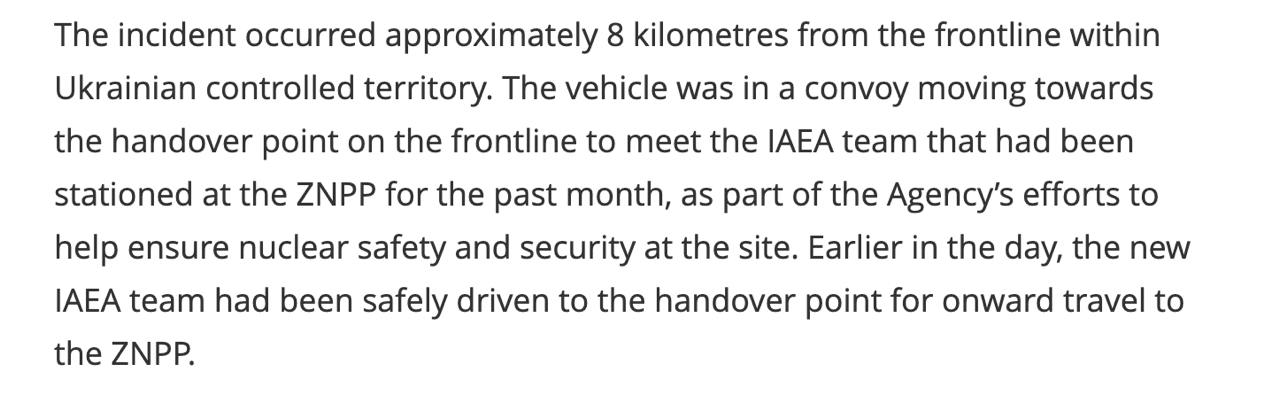 При этом МАГАТЭ уже официально подтвердило, что автомобиль был атакован на территории, подконтрольной Украине - примерно в восьми километрах от линии фронта. Ни к одной из сторон агентство обвинений не выдвигало.