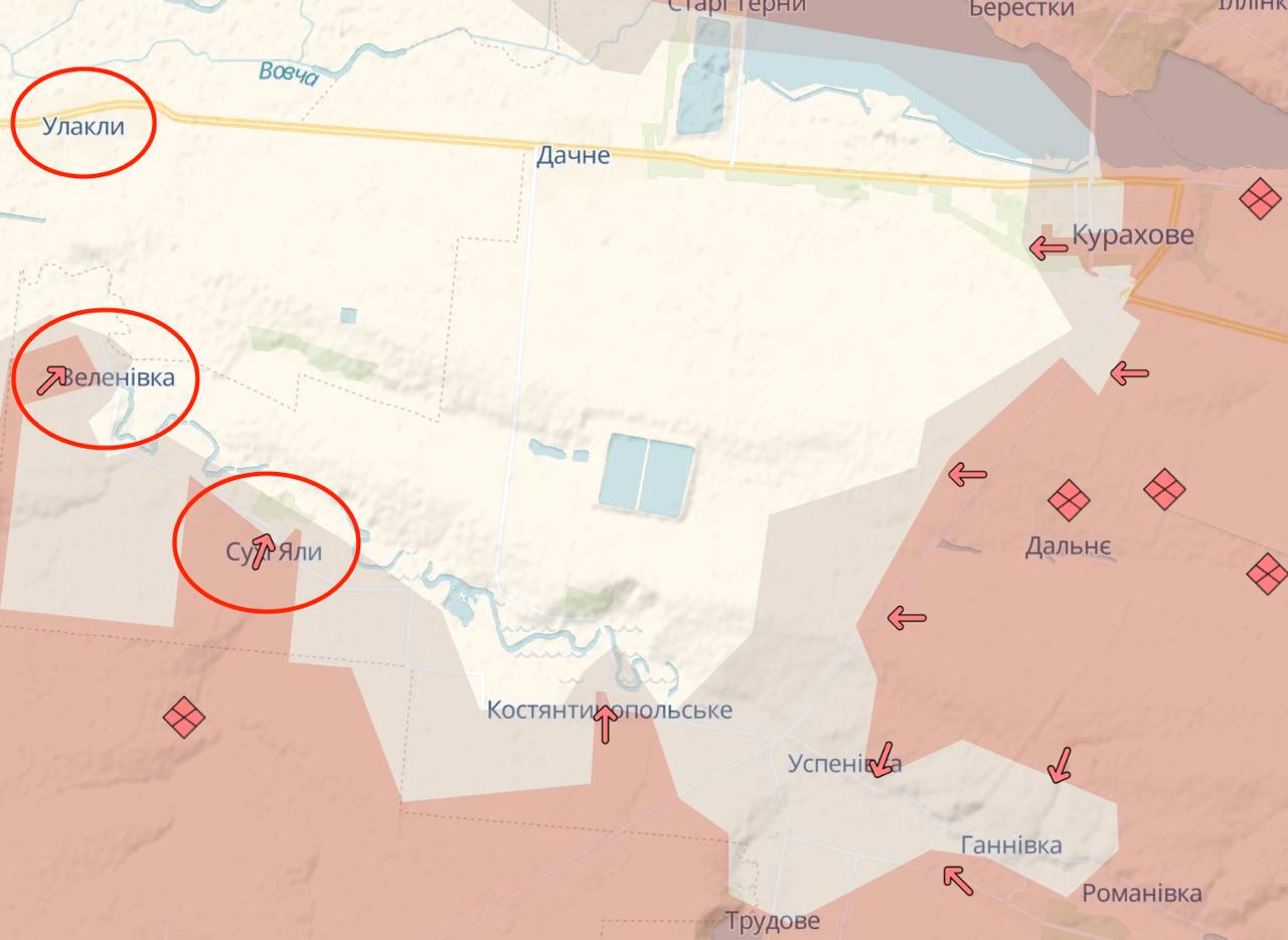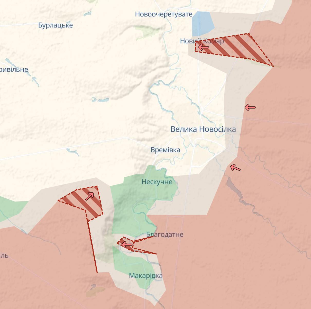 Также к югу от Великой Новоселки российские войска вошли в село Сторожевое, которое пытаются отрезать от основных сил, и штурмуют Нескучное.