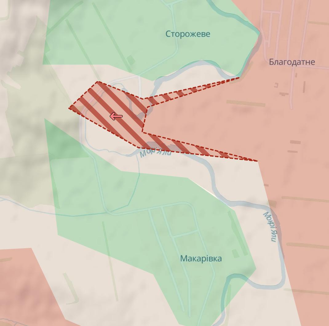Судя по обновленной карте Deep State, ударом со стороны Благодатного россияне практически отрезали Макаровку от соседнего Сторожевого. Также они продвинулись в сторону Сторожевого с запада.