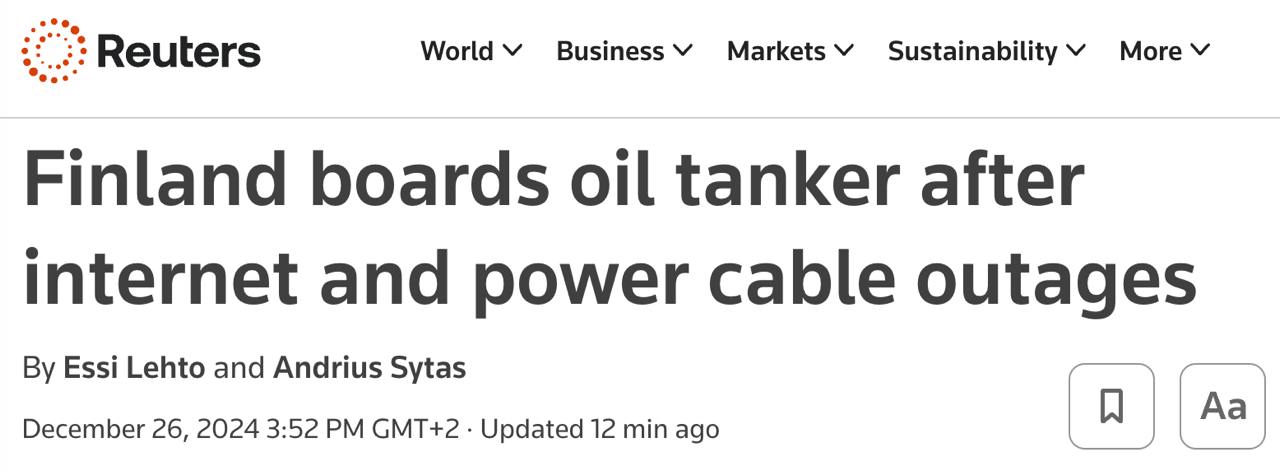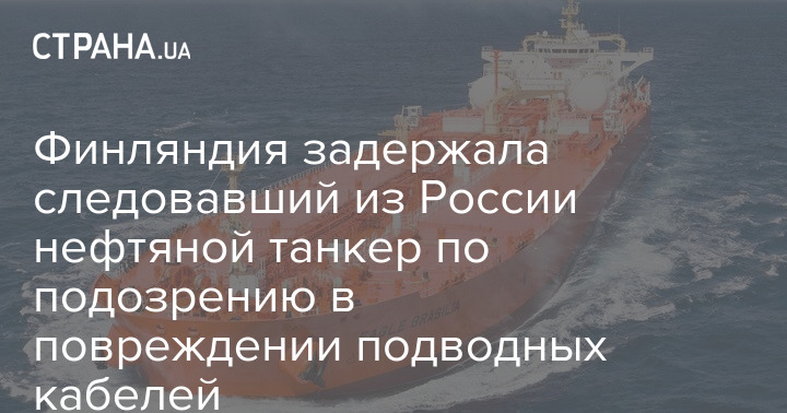 Финляндия задержала нефтяной танкер Eagle S под флагом Островов Кука, следовавший из России, по подозрению в повреждении сразу четырех кабелей в Балтийском море: одного - электропитания и трех - интернет-линий, соединяющих Финляндию и Эстонию.