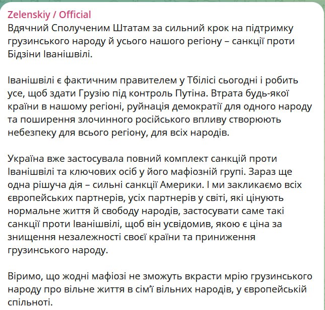 "Мафиози". Зеленский поблагодарил Штаты за санкции против основателя "Грузинской мечты"
