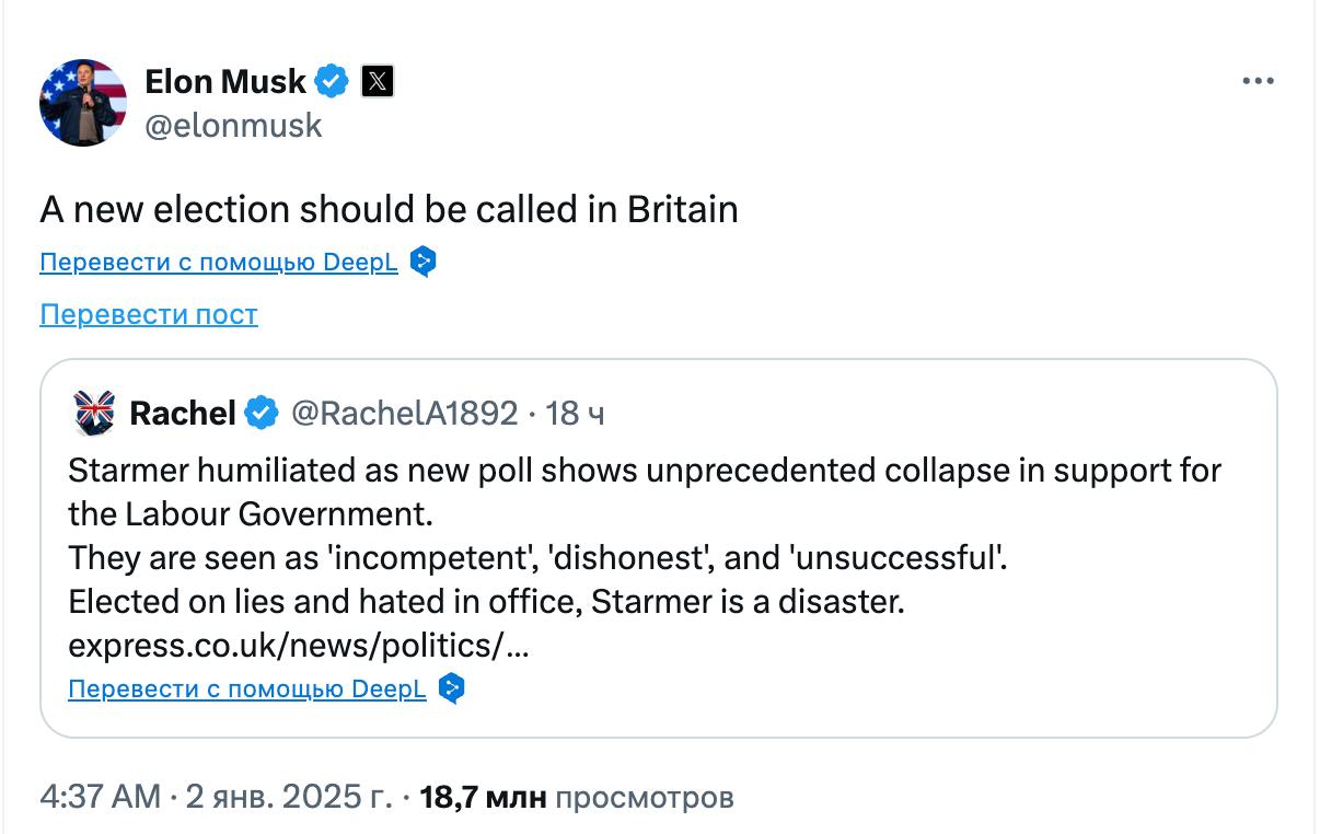 Отвечая на одно из сообщений о новом опросе, свидетельствующем о падении поддержки лейбористского правительства Стармера, Маск призвал провести повторные выборы.