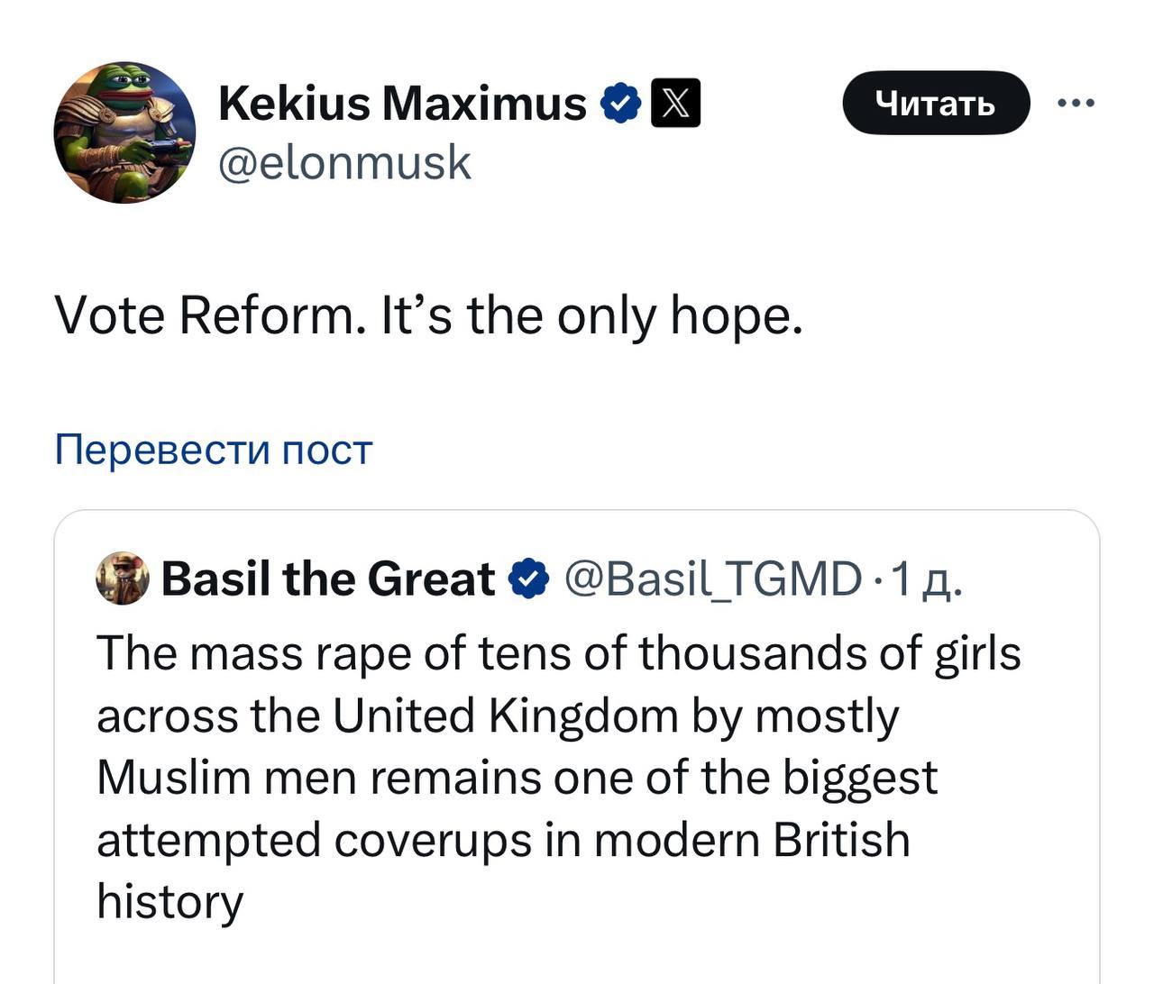 "Единственной надеждой" миллиардер считает правую партию Найджела Фаража Reform UK. По его словам, только она может "спасти" Великобританию.