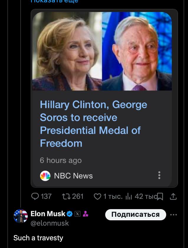 Ближайший соратник новоизбранного президента США Илон Маск скептически прокомментировал награждение Сороса и Клинтон.