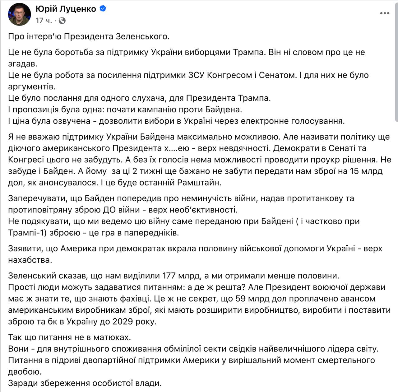 "Я не считаю поддержку Украины Байденом максимально возможной. Но называть политику еще действующего американского президента х@йней – верх неблагодарности. Демократы в Сенате и Конгрессе этого не забудут. А без их голосов нет возможности проводить решение. Не забудет и Байден. А ему за эти 2 недели еще желательно не забыть передать нам оружие на 15 млрд долл., как анонсировалось", - пишет Луценко.