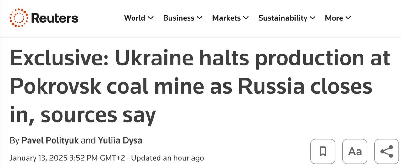 Украина остановила добычу угля на Покровской шахте из-за приближения армии РФ.
