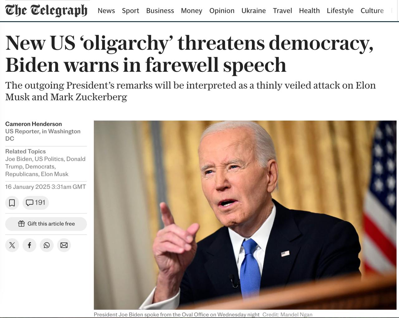 Уходящий с поста президента США Джо Байден в своей прощальной речи заявил, что новая технологическая "олигархия" США угрожает всей демократии, имея в виду Илона Маска и Марка Цукерберга и других сверхбогатых людей из технологической сферы.