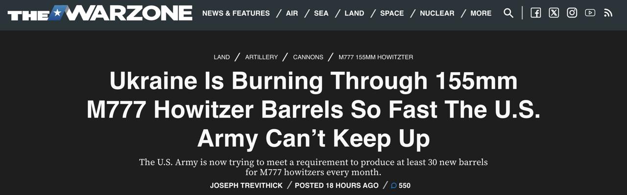 15:33 Украина сжигает стволы 155-мм гаубиц M777 быстрее, чем США их производят. Поэтому планируется запуск второго производства, пишет The War Zone.