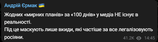 "Никаких "мирных планов за 100 дней" не существует в реальности. Под это маскируют только вбросы, которые чаще всего легализуют россияне", - заявил Ермак.
